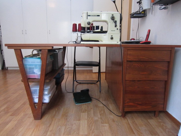 Let me tell you a sad, sad story of the one worst moving-purges I've ever done (I promise, there's a happy end!). When I lived with my mom I had a pretty 60s teak writing desk. It was a perfect size, 80x120 cm, easily de-constructed for storage or transport and with two small drawers at one side, making it perfect to sew at since you could easily have two machines next to each other. However, this was before I fell in love with vintage, when 60s teak was just quaint, and before I started sewing on such an everyday basis or owned two sewing machines. But I did love the desk, and something about it spoke to me (maybe a premonition of the love affair to come! ;) ). I was moving up north (leaving home for the third and final time), having rented a partly furnished one bedroom appartement, with no additional storage space, second hand. At the same time mom and my sister Kajsa was moving to Malmö, and my brother Joakim was leaving the nest. The house was sold and everybody would have less space in their new homes - lot's of hard choices were made.